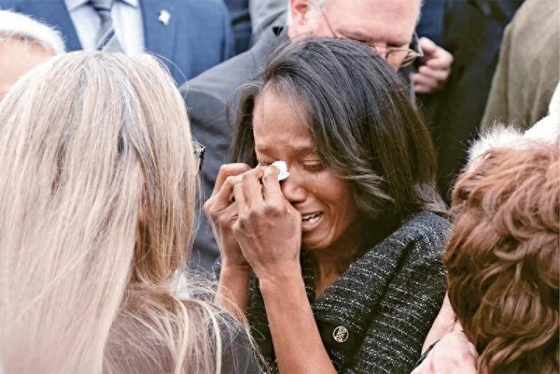 2021年1月6日,特朗普支持者暴力突破安保,闯入国会大厦。参众两院认证2020年总统选举结果的联席会议被迫中断,主持会议的时任美国副总统迈克·彭斯同数百名议员们惊慌撤离或躲藏股E融,约140名警察受伤。图为2023年1月6日,在美国首都华盛顿的国会大厦外,一名前国会警察遗孀在纪念“国会山骚乱”两周年纪念仪式上流泪。 新华社记者 刘杰/摄